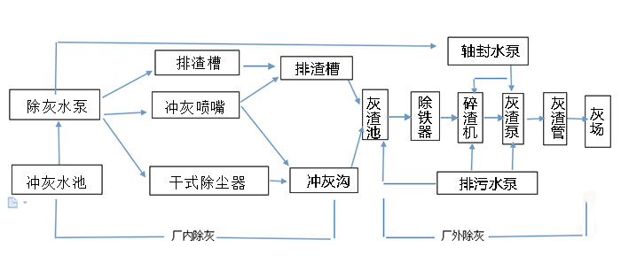 這種除灰系統(tǒng)的主要設(shè)備有高壓沖灰水泵、低壓沖水泵和噴嘴除灰器等。排渣槽和除灰器灰頭下的灰渣通過(guò)低壓沖灰水泵供給的水排出,噴嘴除灰器和噴射輸送用水則由高壓沖灰水泵供水。渣和灰與沖灰水混合后經(jīng)噴嘴除灰器送出。這種除灰系統(tǒng)輸送距離為3~5km。由于其效率低,耗水量大,一般只在間斷除灰的中、小型鍋爐使用。