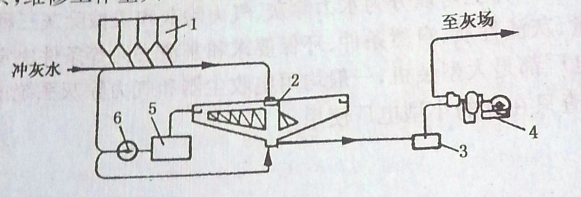 1. 濕式除灰器斗;2.濃縮池;3.吸漿池;4、油隔離泥漿泵;5. 回水池;6.會(huì)水泵