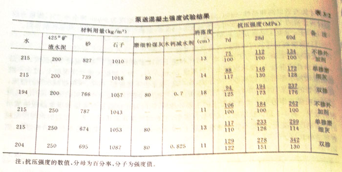 表3—2是泵送混凝土強度試驗結(jié)果。單摻磨細粉煤灰時,7d強度可提高10%~17%,28d強度可提高26%~30%,60d強度可提高14%~28%。而當磨細灰和木鈣減水劑雙摻時,強度性能更好。7d強度可以提高22%~25%,28d強度可以提高50%~70%,60d強度可以提高30%~70%摻磨細粉煤灰和木鈣減水劑強度增長速率大,既提高早期強度,也發(fā)揮了后期強度。